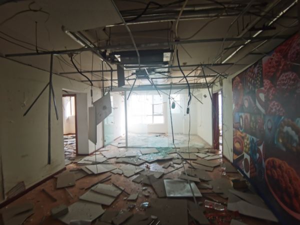 经济观察网在文化大厦公寓A楼6层发现,走廊的吊顶被震落,铁架子和天花板掉落了一地;住户家中一片狼藉,从入户门到窗户,从内部装修到家具,全部破损严重。
