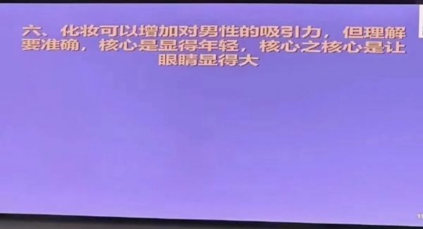 在这张PPT里,这位教授规劝女性通过化妆让眼睛显得大来迎合男性的喜好,让我想到了最近看的《服美役:美是如何奴役和消费女性的》这本书里提到的一位亚裔女主持人的遭遇。