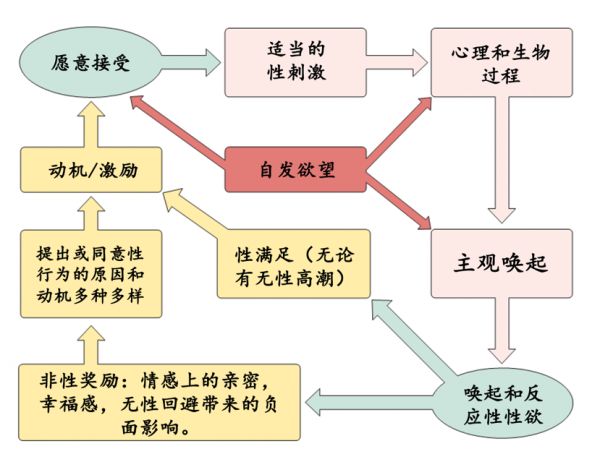 在这个性反应模式模型中,女性主动自愿的接受和性冲动相互作用,而性刺激和生物因素的结合可以带来唤醒和欲望。多种因素可以提供影响后续性行为动机和反应水平的反馈,例如性满足和其他与性活动无关的亲密行为奖励。无论是否获得性高潮,女性都可以从与伴侣的积极情感交流和互动中获得性满足。