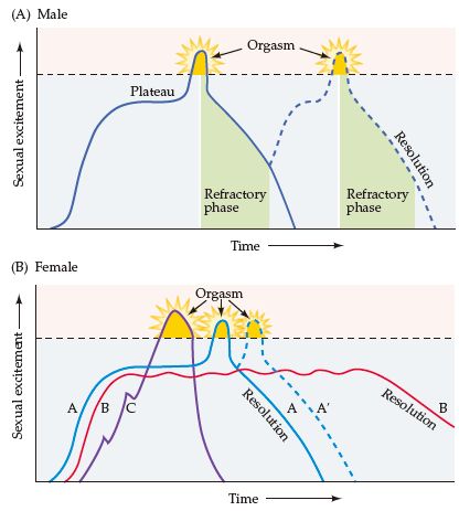 在实验室研究性反应模式的先驱威廉姆·马斯特斯(William H. Masters)和弗吉尼亚·约翰逊(Virginia E. Johnson)在1966年就已经证实,男性的性反应模式表现为一种基本模式,且多数在性高潮后有一个绝对不应期;女性则表现出更多种类的性反应模式,且许多女性可以快速连续地获得多次性高潮。