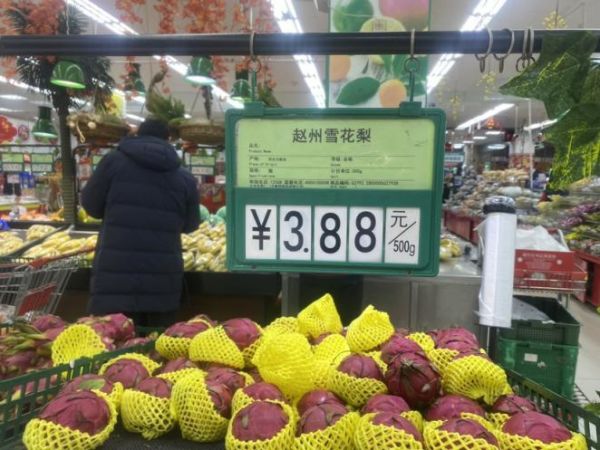 在常营长楹天街购物中心内的永辉超市,记者打开美团外卖,比对了各个区域商品门店与线上价格,发现包装食品、日化、饮料等区域的商品门店价格与线上价格统一。不过,在实行散装售卖的蔬菜水果区,由于门店与线上计价方式不同,同款商品的价格存在着差异。其中,赵州雪花梨门店每500克3.88元,而外卖平台每份750克,售价为8.9元,算下来单价几乎高出一半。红麒麟西瓜门店每500克7.99元,而线上规格为3.5千克的售价达到了65.9元,换算下来每500克高出了1.4元。蒜薹在门市与外卖平台的价格均为9.9元,但门市计价规格为500克,外卖平台标注的规格则为300克。