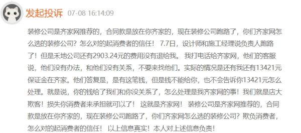 其中,有消费者在黑猫投诉指出,自己签约的装修公司入负责人跑路了,但是装修公司还有2903.24元的费用没有退还,且还有13421元保证金在齐家。但消费者联系齐家网后对方给出的答复令自己并不满意。