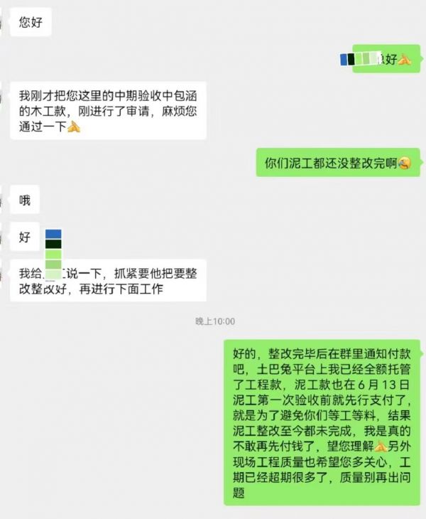 据该网友的聊天记录,在泥工还没整改结束的情况下,工程负责人已经开始申请木工款。而该网友回复称,“平台上我已经全额托管了工程款……我是真的不敢再先付钱了,工期已经超期很多了。”
