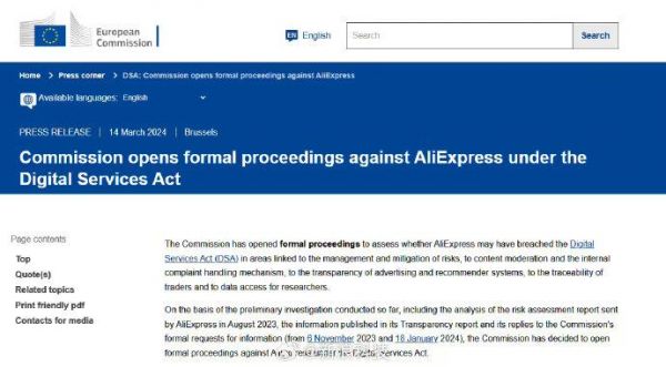 欧盟对阿里速卖通启动正式调查,评估其是否违反《数字服务法》