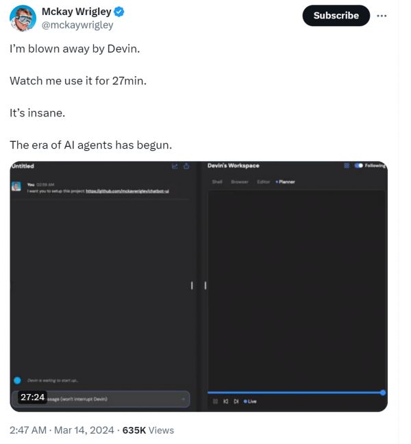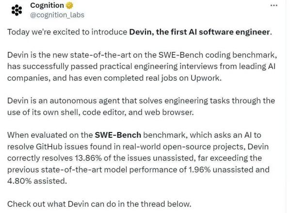 3月13日,Cognition AI在 X 上推出了全球首个AI软件工程师Devin。