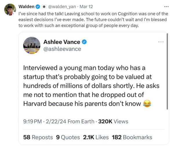 而Walden Yan则是Cognition AI的首席产品官。据悉,为了创办Cognition AI,Walden Yan不惜背着父母从哈佛辍学。对此,Walden本人回应道:“离开学校创办Cognition是我做过最简单的决定。”