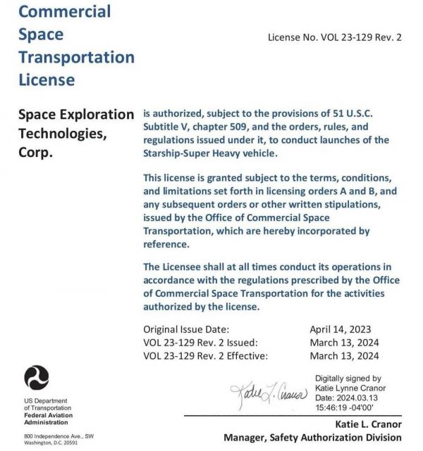 如FAA所言:“SpaceX 符合所有安全、环境、政策和财务责任等要求。”