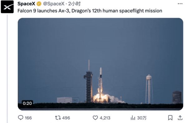2024年1月19日,SpaceX再次成功进行私人飞行任务。此次任务由美国一家商业航天公司发起。4位私人宇航员搭载龙飞船,借由猎鹰9号火箭推送升空。