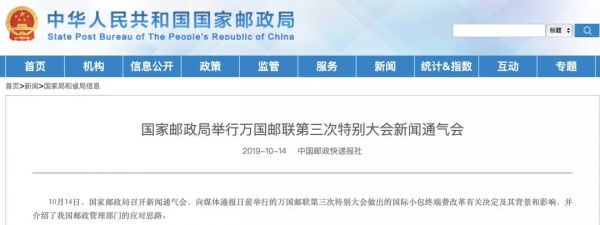 10月14日,国家邮政局召开新闻通气会,向媒体通报日前举行的万国邮联第三次特别大会作出的国际小包终端费改革有关决定及其背景和影响,并介绍了中国邮政管理部门的应对思路。