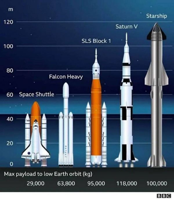 从BBC给出的对比图里可以看到,几枚火箭都是在航天史上排得上名号的大家伙。从左到右包括了能够载着一船人往返太空的航天飞机;SpaceX自家的重型猎鹰火箭;如今参与到了美国新一轮登月计划中的SLS超重型火箭;以及目前为止唯一执行过载人登月任务的土星五号火箭。