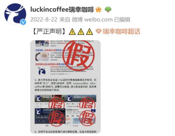 对于被冒名顶替的现象,瑞幸方面曾作出官方声明,强调“瑞幸咖啡旗下未开发任何子品牌,网络上关于瑞幸及其子品牌加盟或代理的信息均为虚假信息”,且强调“各大平台有企业蓝V认证的才是瑞幸咖啡官方账号”。
