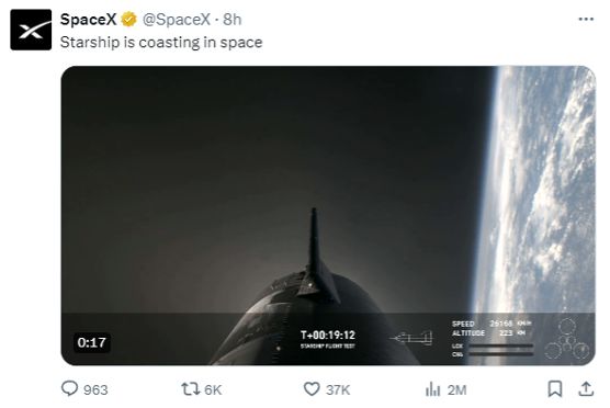 图片来源:SpaceX 社交账户,星舰成功进入太空轨道