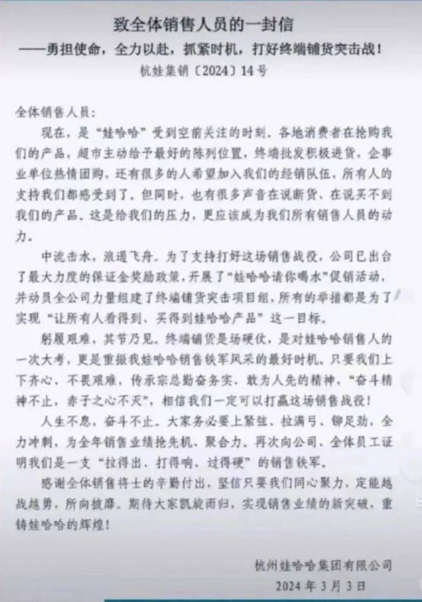 近日,一封署名娃哈哈“致全体销售人员的一封信”在网上流传。