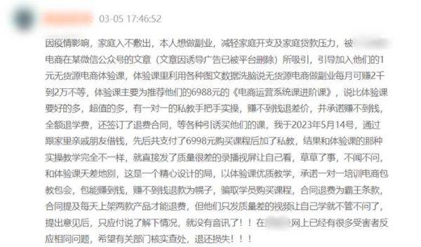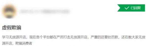 网络投诉平台显示,今年2月18日,有创业者投诉称,“以无货源模式作为商业噱头,对众多学员进行洗脑。由于学员们都是‘小白’,因此对所谓的无货源模式并不了解。目前各大电商网络平台正在严厉打击无货源店铺,例如无法上品、链接失效,甚至存在非法行为等情况。这与当初培训时所提及无脑赚钱的说法根本不同。”