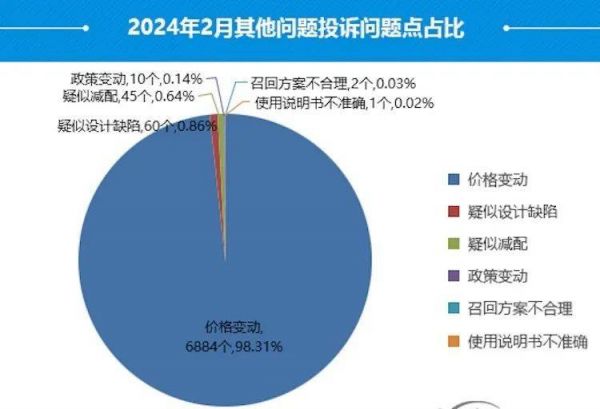 除了前述车主外,在车市降价潮下,不少第三方投诉平台相关投诉量猛增。据车质网3月2日发布的统计数据显示,今年2月车质网共受理车主有效投诉信息15411宗(其中含第三方平台和后装轮胎投诉共16宗),刷新了历史同期最高纪录,同比上涨53.7%。在2月份的其他问题中,价格变动一家独大,几乎垄断了绝大部分的投诉故障数,占比较1月份提高21.1个百分点。