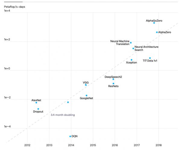 但是随着研究的推进,OpenAI发现人工智能系统除了需要算法创新,还需要使用最多的计算能力。根据OpenAI的估算,从2012年的AlexNet到2018年的AlphaGo Zero,计算量增加了30万倍。