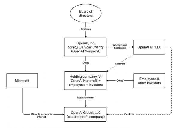 首先,非营利组织OpenAI Nonprofit全资拥有并控制一个管理实体OpenAI GP LLC,该实体控制和管理营利性子公司。