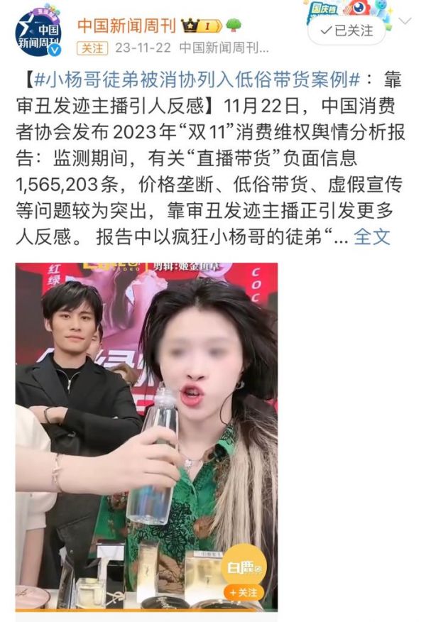 再来看,低俗带货也引发热议。在中国消费者协会发布的《2023年“双11”消费维权舆情分析报告》中,提到知名网红小杨哥的徒弟“红绿灯的黄”靠审丑发迹令人反感,因此被消协列入低俗带货案例。