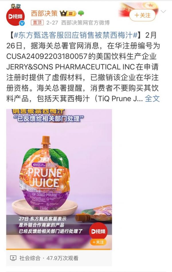 图源:截自微博海关总署在2月提醒停止食用天萁西梅汁,由于该饮料生产企业JERRY&SONS PHARMACEUTICAL INC在申请注册时提供了虚假材料,已撤销该企业在华注册资格。