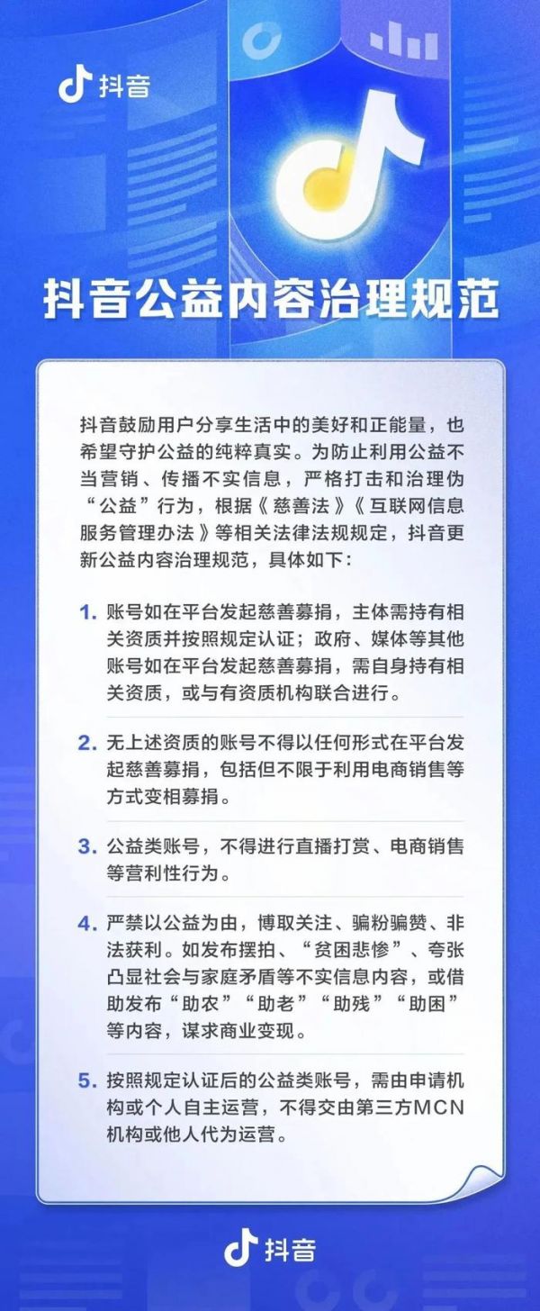 2023年的抖音公益内容治理最新规范也明确提出要求,“公益类账号不得进行直播打赏、电商销售等营利性行为”。执行方面,抖音也在加大巡查力度,下架相关视频与封号行动同时进行,推动行业朝着更加规范的方向发展。