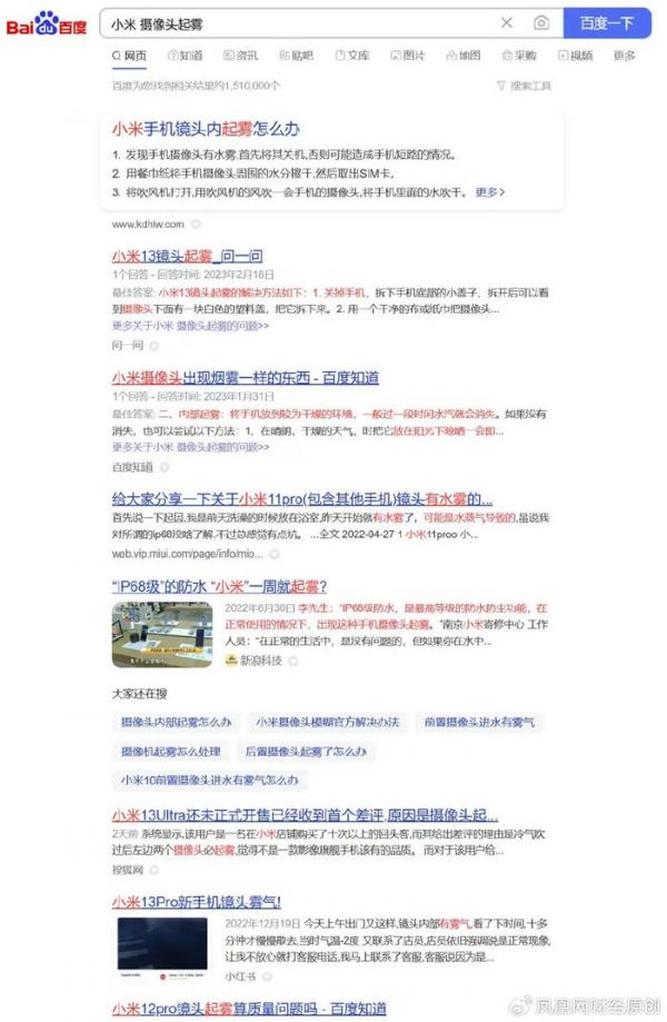 百度“小米 摄像头起雾”关键词,找到结果约151万个,涉及小米 11 Pro、11 Ultra、12 Pro、13 Pro等机型。