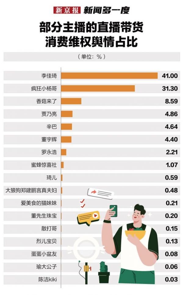 3月14日,北京阳光消费大数据研究院、消费者网等机构发布《直播带货消费维权舆情分析报告(2023)》,李佳琦、贾乃亮、董宇辉等17位主播作为研究分析对象出现在报告中。他们涉及哪些问题?谁的维权舆情最多?消费者直播购物踩坑到底该由谁担责?