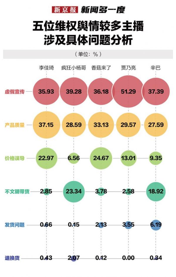 具体看,贾乃亮的虚假宣传舆情最突出,其次是疯狂小杨哥,李佳琦的产品质量舆情最突出,香菇来了的价格误导舆情排名第一,疯狂小杨哥的不文明带货问题舆情最突出。发货和退换货问题舆情都占比较少。