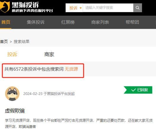 主编通过搜索黑猫投诉平台发现,包含“无货源”相关的词条超过6500个。其中,针对“无货源店铺”赚差价的投诉存在于多个电商平台。
