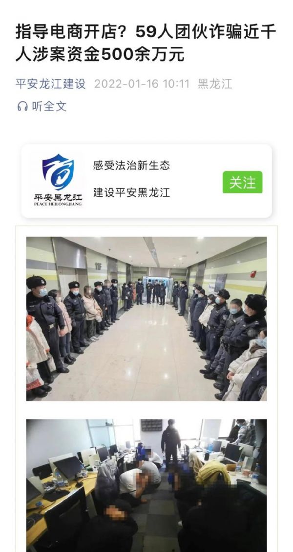 早在2022 年 1 月,哈尔滨市公安局就打掉一个电信网络诈骗团伙,该团伙以指导电商开店为名,骗取客户的开店培训费、网店包装费、代运营费,8 个多月诈骗近千人,涉案资金 500 余万元。