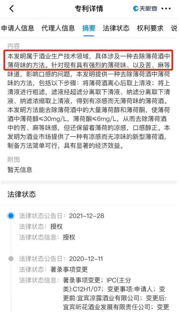 在该项专利中,听花酒业称其发明提供一种将薄荷酒离心后取上清液,再经过粗滤、超滤、纳滤后,得到有凉感而无薄荷味的薄荷酒的方法。该专利为2018年申请,2019年公布,2021年授权。