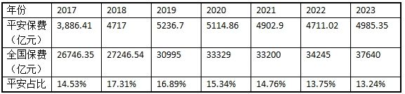平安份额也不理想。如果将平安公布的人身险(含寿险、养老险、健康险)原保费收入与监管部门发布的全行业人身险原保费收入对比,可以发现自2018年平安人身险占比达到17.31%之后,份额逐渐下滑,到了2023年降至13.24%。