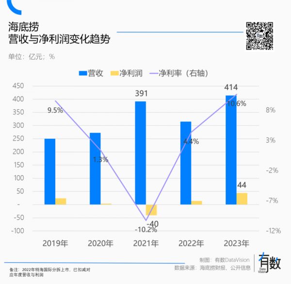 各地海底捞陪消费者热闹了一整年,最终也实实在在地赚了钱:2023年,海底捞营收与利润均创下历史新高,分别不低于414亿与44亿。