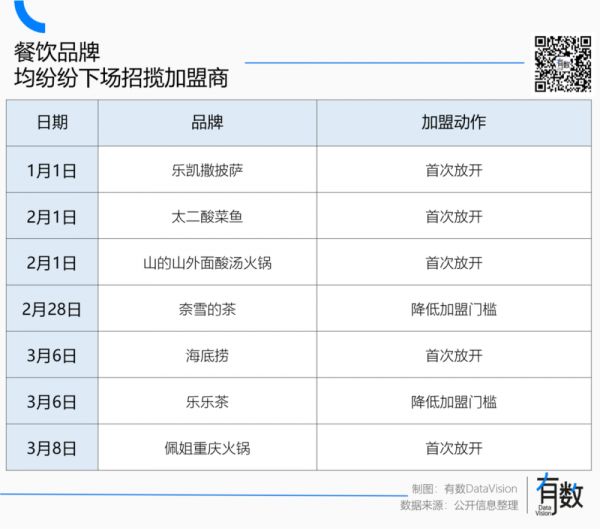 抢在年初放开乐凯撒披萨已经小有成绩,不仅已有15家门店顺利开业,更是一天就完成了5家门店的签约[2];不甘落后的九毛九,次月第一天也宣布将王牌“太二酸菜鱼”赋能加盟商。
