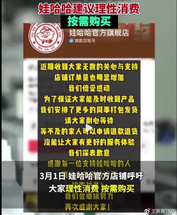事实上,在前段时间,娃哈哈销量暴涨的时候,宗馥莉已经表态了感谢大家的支持,并说让大家按需购买,理性消费。