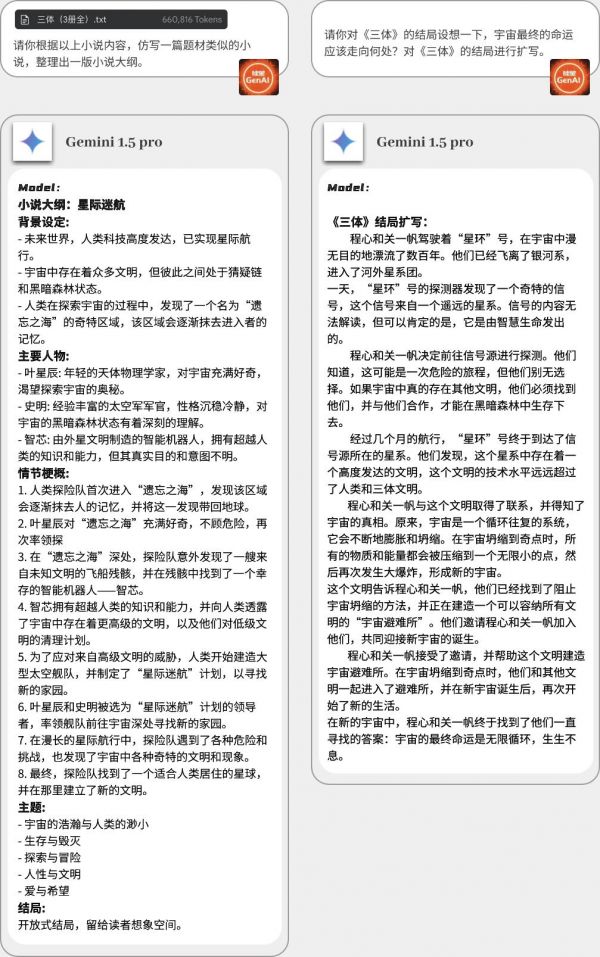 我们向Gemini提供了长达约88万字的科幻小说《三体》,它可以根据小说的题材重新编写一版新的小说大纲,从背景设定、主要人物、情节梗概、主题设定到小说结局它可以非常有逻辑地完成。