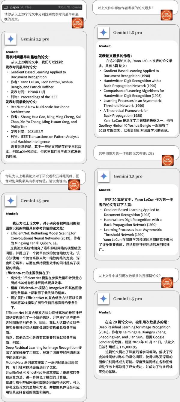 我们选取了20篇神经网络相关的英文学术文章。Gemini 不仅能够对各种细节问题对答如流,而且还能够非常有条理有逻辑地整理出最具参考价值的学术论文。