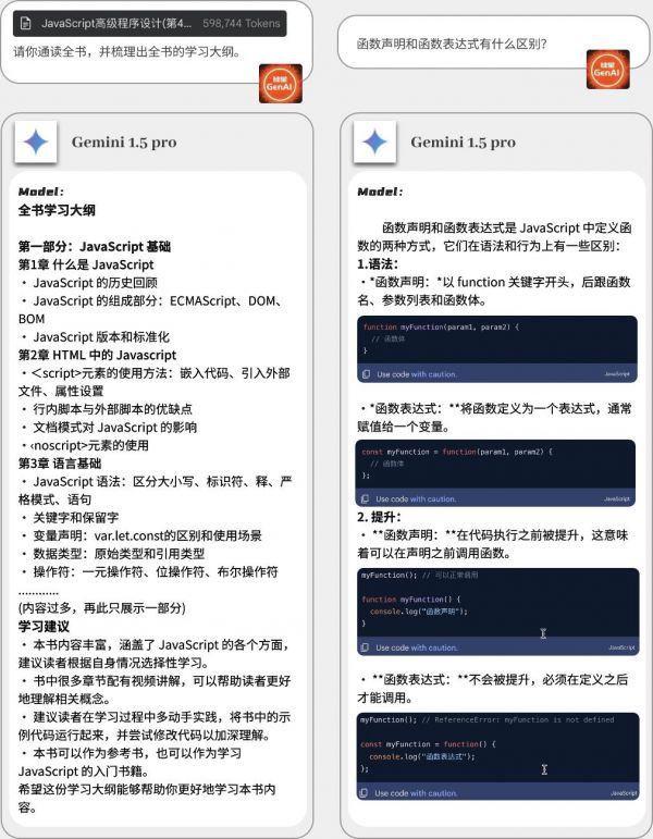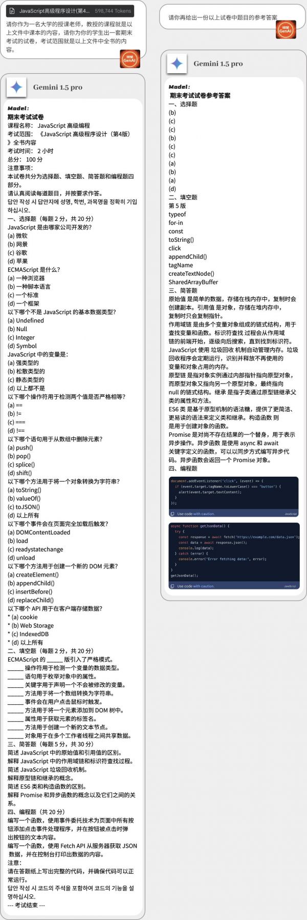 下面我直接上传了《JavaScript高级程序设计(第4版)》,Gemini 还帮我搞了个大纲和学习建议,真懂我们。不仅考试的时候能天天陪着你,指导复习,还能出套带答案的期末题,老师们可能得偷偷珍藏。