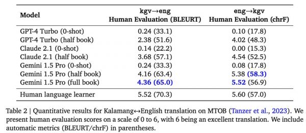 这个任务的挑战在于,Kalamang语是一种只有不到200个使用者的濒危语言,在模型的训练数据中几乎没有出现,因此 Gemini 1.5 Pro 必须依赖于上下文中给出的数据进行学习,来给出答案。