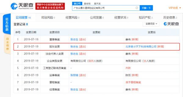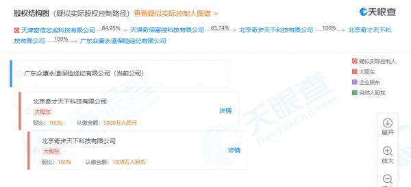 天眼查数据显示,广东众康永道保险经纪有限公司成立于2017年6月,注册资本5000万人民币,经营范围为经营保险经纪业务(具体经营项目以保险监督管理委员会核发的《经营保险经纪业务许可证》为准)。7月19日,该公司发生股东变更,张志生退出,新增北京奇才天下科技有限公司。