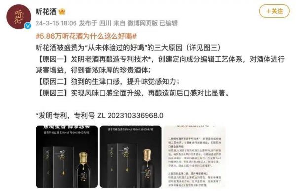 这些在央媒上的硬气投放、和“齐名”名酒的噱头似乎让听花酒有种合情合理的“傲慢”:我在这家媒体有投放,就进所谓的“白名单保护”了。但事实上并不是,距离315晚会开播2小时前,听花酒官方微博还一本正经在 #5.86万的听花酒为什么这么好喝# 中解释原因,但随后听花酒就被央视曝光。