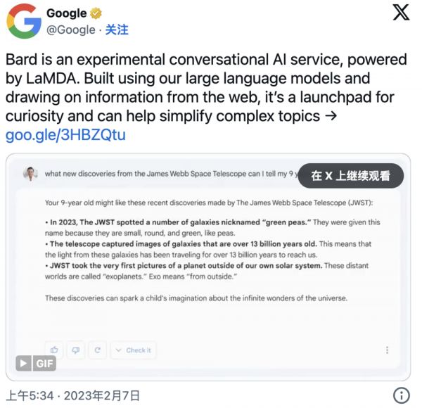 2023年2月,谷歌推出的Bard在一个广告中说,它可以为9岁的孩子讲述詹姆斯·韦布太空望远镜的科学新发现,然而在视频广告里,它却说错了(弄错了第一张系外行星的照片)。这波反向营销(?)直接让谷歌的母公司Alphabet市值下跌了1000亿美元。