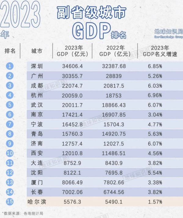 但短时间的绝对值的可观,掩盖不了相对比较下的颓势。经济数据说明一切,2023年哈尔滨GDP及同比增长率,在全国15个副省级城市排名中双双垫底。