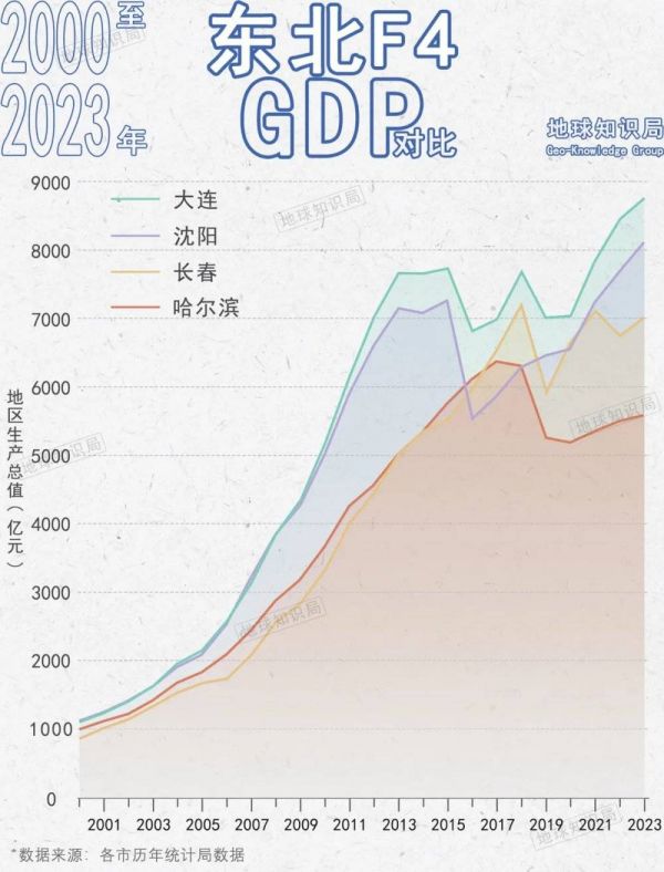 2000年初,“东北F4”的GDP均在千亿上下,沈阳和大连20年间显示出较为稳定和强劲的增长趋势,长春在2010年之后甩开哈尔滨加速增长。