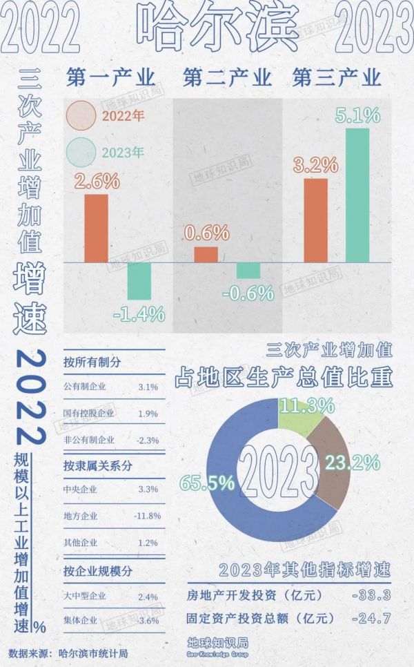 哈尔滨第二产业出现了负增长的现象,规模以上工业亦在萎缩,哈尔滨工业经济以“重型”模式为主,大型国有企业占据主导地位,而新兴产业占比偏低,结构单一,缺乏市场活力和创新动力,特别是中小企业的发展不足。