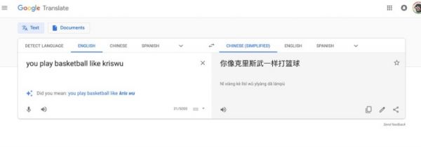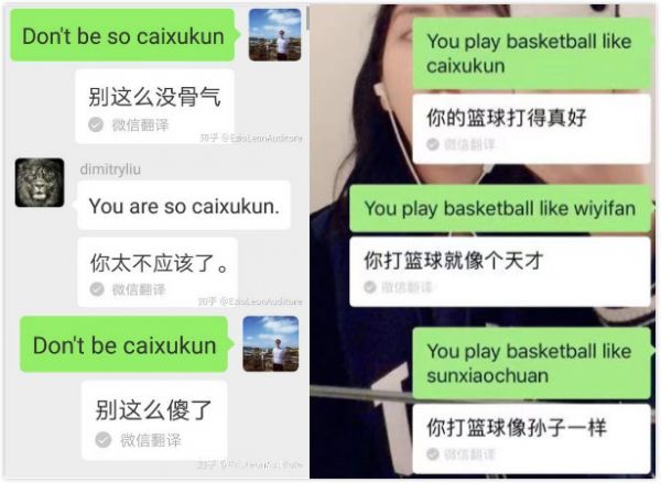 上周末,一组微信“神翻译”的截图,在微博、知乎、豆瓣和虎扑等社交网络上传开。有人输入诸如 "you play basketball like caixukun" 等句子,用微信自带的翻译功能,得到的却是含义完全错误的译文: