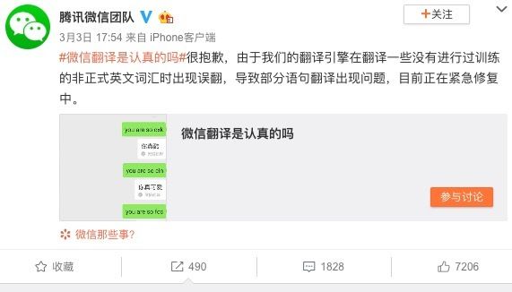 与此同时,官方账号@腾讯微信团队也在微博上宣布,翻译功能目前正在紧急修复中。截至发稿,相关语句仍然无法被微信正常翻译。