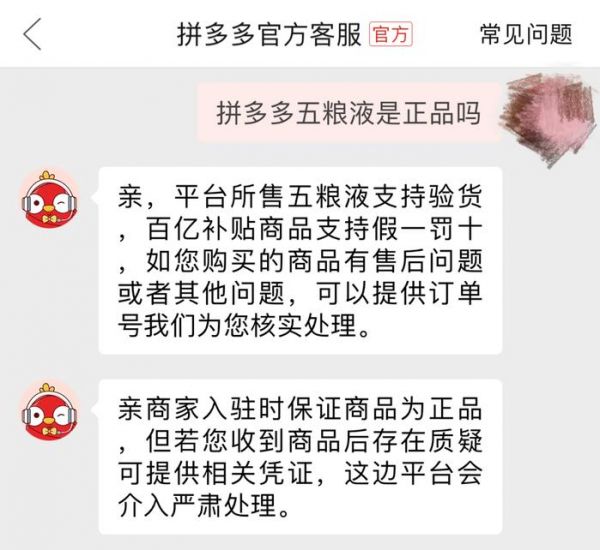 拼多多五粮液是正品吗?对此拼多多官方客服给出的回应是,平台所售五粮液支持验货,百亿补贴商品支持假一罚十。商家入驻时保证商品为正品,若消费者收到商品后存在质疑,可提供相关凭证,平台会介入严肃处理。