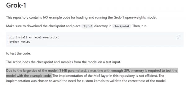 (“由于Grok-1是一个规模较大(314B 参数)的模型,因此需要有足够 GPU 内存的机器才能使用示例代码测试模型。”)