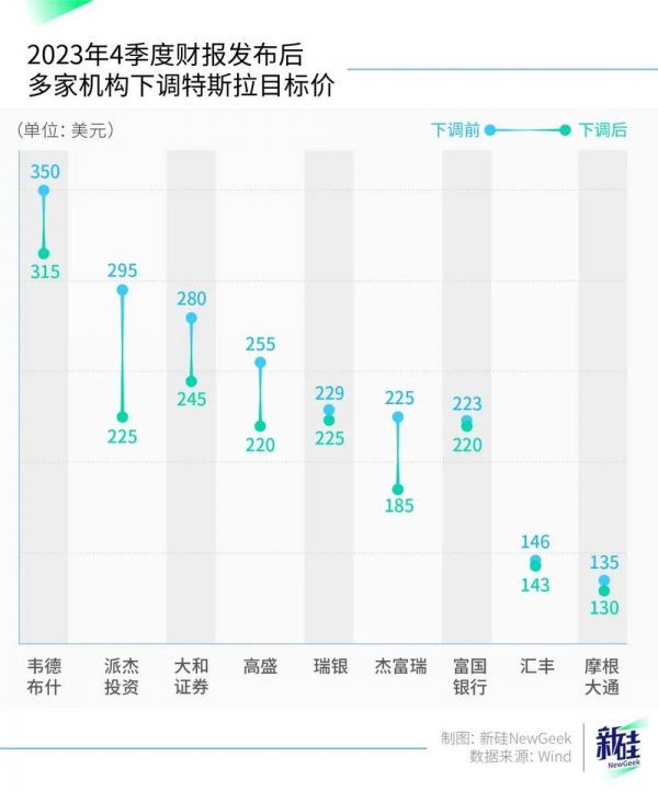 首先是特斯拉2023年Q4财报发布后,有一波看空潮,不少机构下调了特斯拉的目标价。