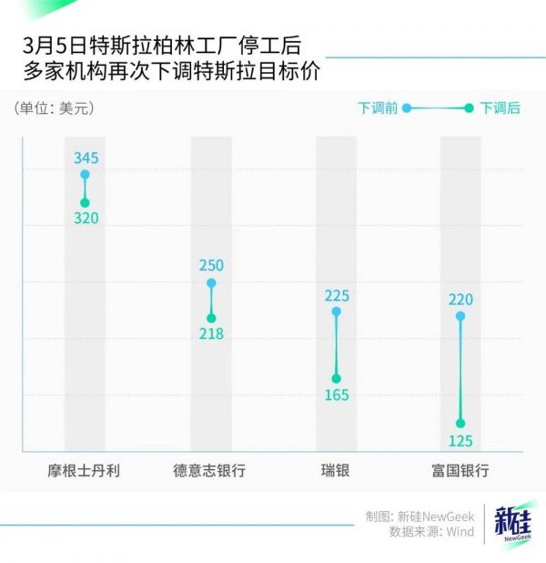 柏林工厂停工当天,又有多家机构对特斯拉的目标价下调,其中瑞银和富国银行在2个月内,对特斯拉的评级进行了第二次下调。